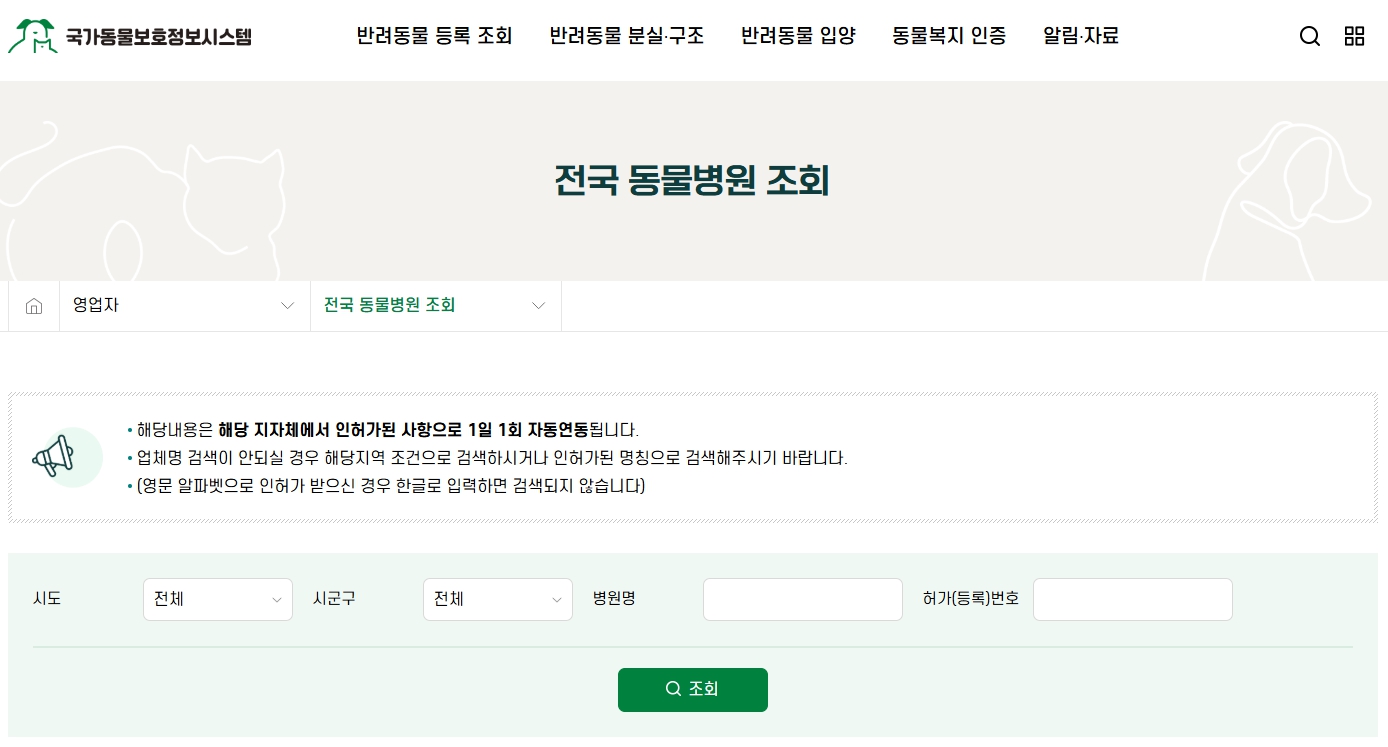 - 동물병원 연합 포털에서 24시 동물병원 필터 적용 검색